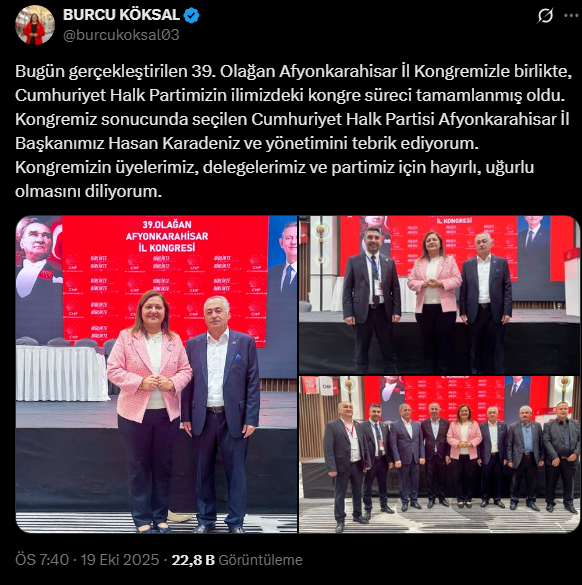 Sosyal medyadan açıklama yapan Köksal, kongreyi paylaşarak,  “Kongremiz sonucunda seçilen Cumhuriyet Halk Partisi Afyonkarahisar İl Başkanımız Hasan Karadeniz ve yönetimini tebrik ediyorum” dedi.